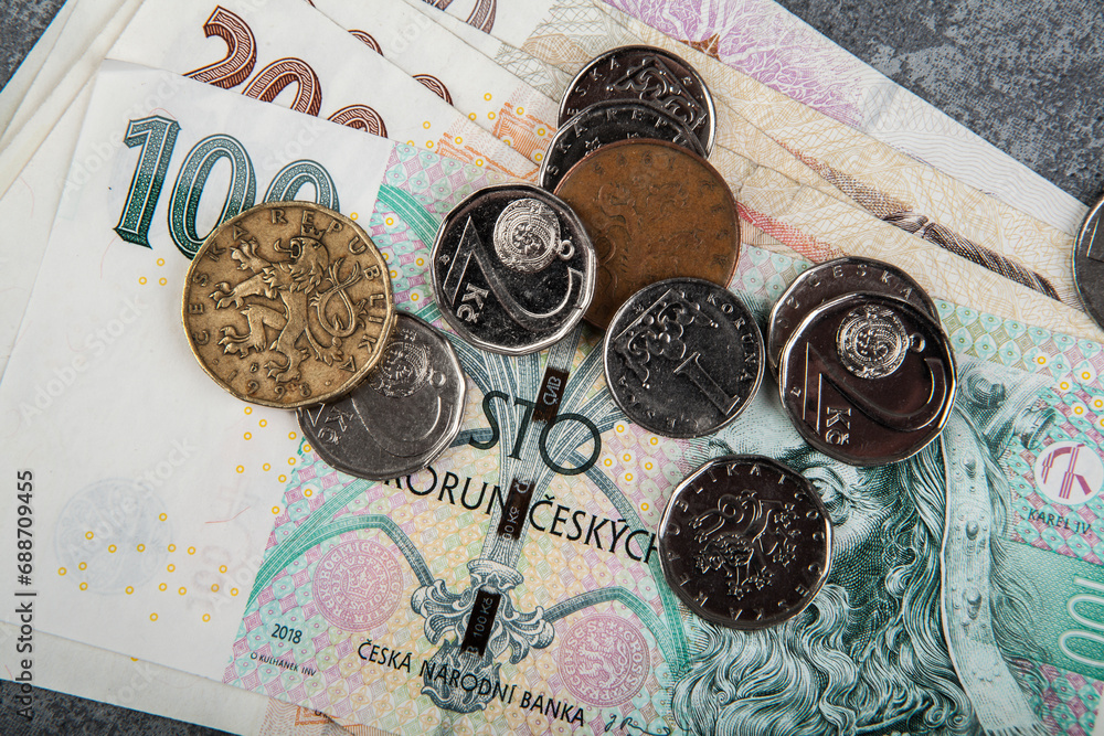 Close-up of banknotes of the Czech National Bank. Currency in the Czech Republic.