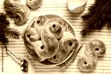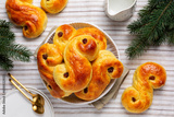 Homemade swedish St Lucia saffron buns. Also called lussekatt or lussebulle, Cornish tea treat bun or revel bun, is a spiced yeast-leavened sweet bun with raisins. Christmas decoration, top view.