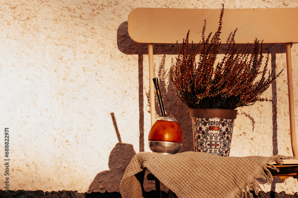 Mate calabash with bombilla. Healthy infused drink, classic Yerba mate tea on a chair on a cozy patio, backyard. Hot beverage on a terrace. Traditional Latin America cuisine. Useful drink still life.