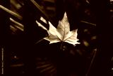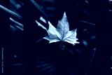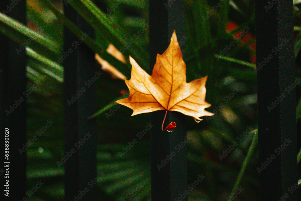 A dry yellow orange maple tree leaf on a black fence in botanical garden. Bright flora background in dark key. Autumnal wallpaper with falling from the trees foliage in a park, parkland in rainy day.