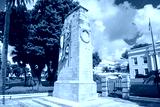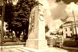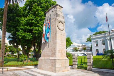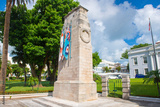 Cenotaph on Front Street at Cabinet Building in historic commercial buildings in Hamilton city center in Bermuda. Hamilton is the capital of Bermuda.