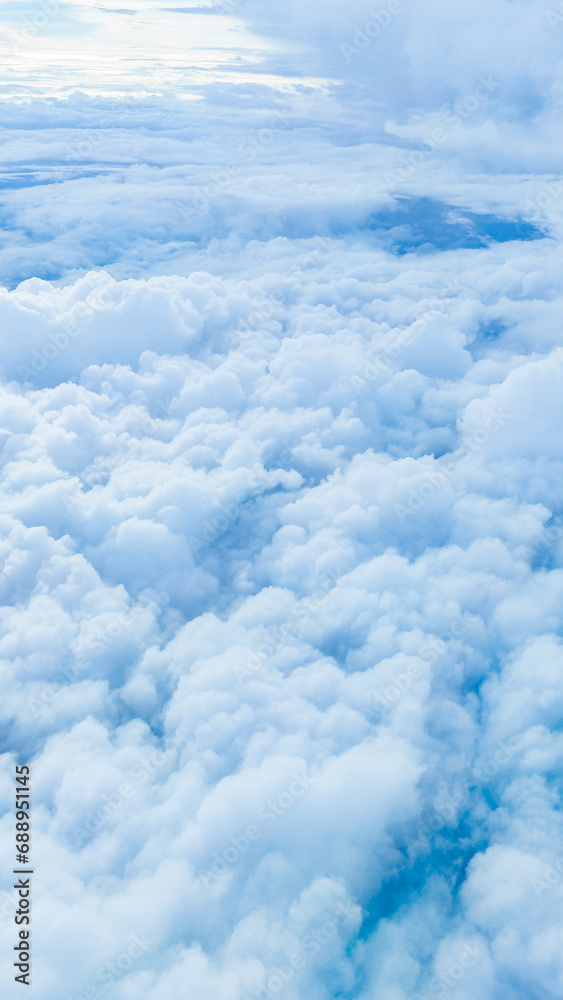 Sky blue background with white clouds, showcasing the beauty of nature. View from airplane window