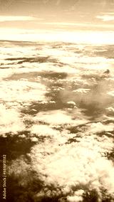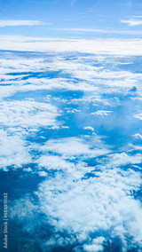 Sky blue background with white clouds, showcasing the beauty of nature. View from airplane window
