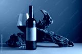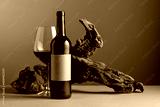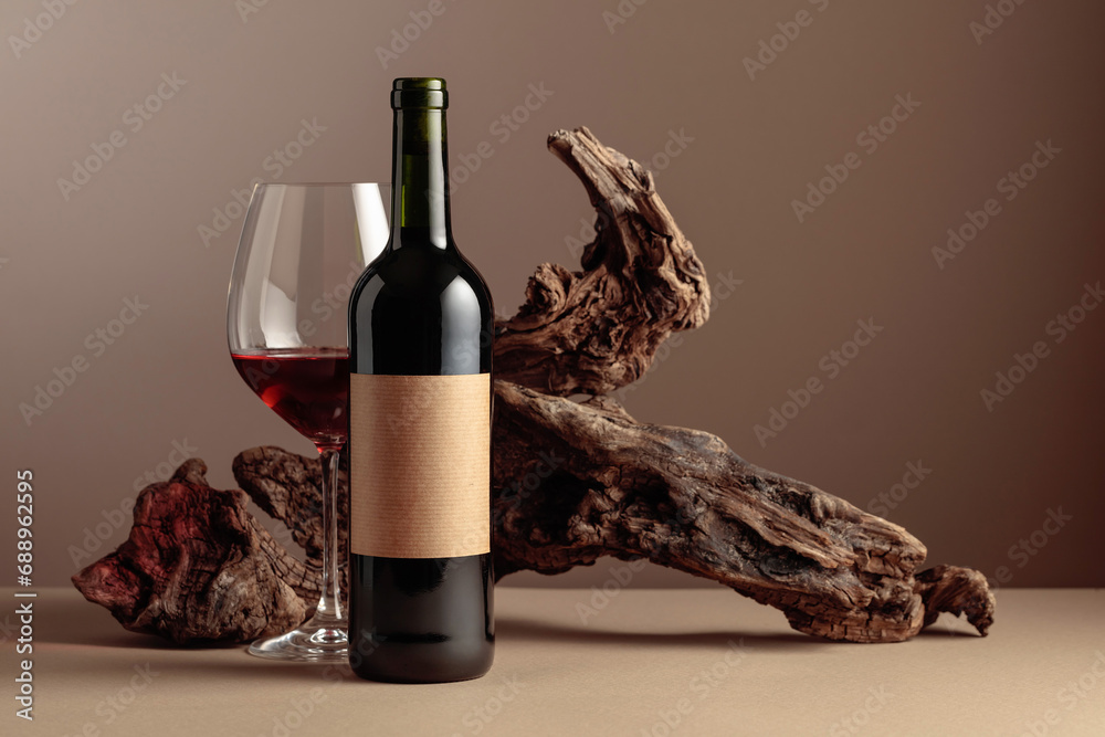 Bottle and glass of red wine with old weathered snag.