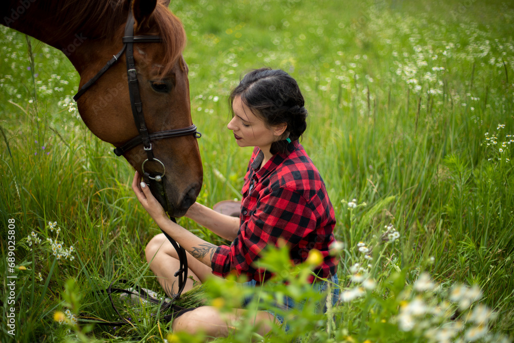 A young beautiful girl with dark hair spends time with her horse