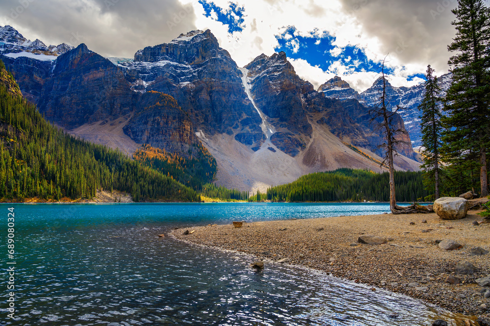Moraine lake in Banff National Park, Alberta, Canada, with snow-covered peaks of canadian Rocky Mountains and heavy clouds.