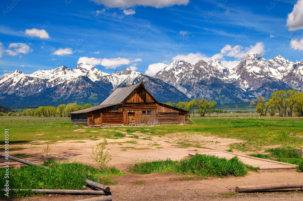 Historic T. A. Moulton Barn at Mormon Row in Grand Teton National Park on a sunny summer day, with snowcapped Teton Mountain Range in the background.