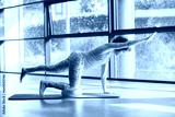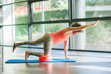 Mature woman practicing balance pose during pilates training, using soft ball for knee