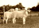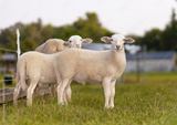 Katahdin sheep lamb twins looking at the camera on a green pasture in North Carolina.