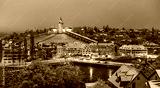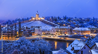 Twilight scene of the medieval fort and landmark of Swiss town Schaffhausen Munot with fresh snow in winter