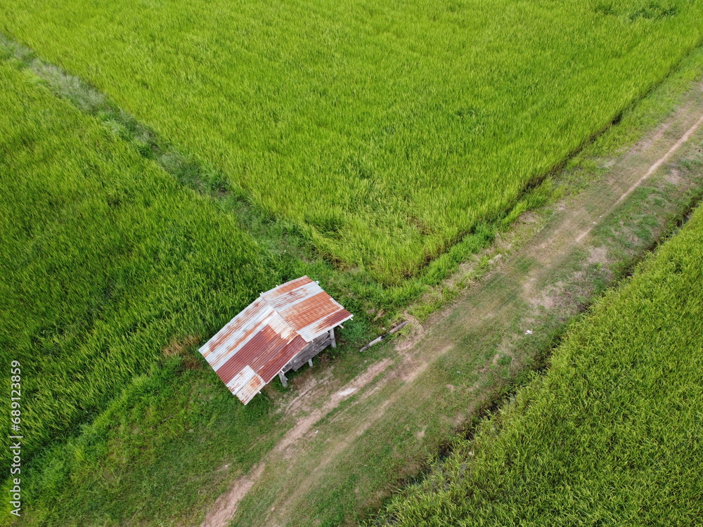 Aerial photography of the lush green rice fields.