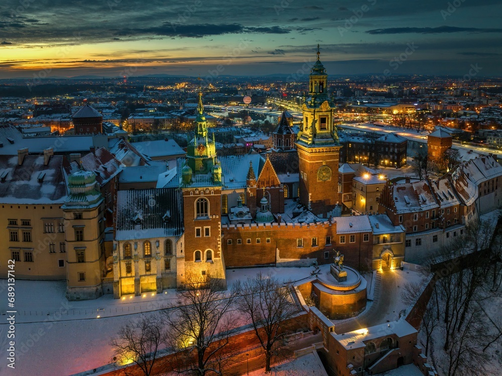 Zamek Królewski na Wawelu zimą widziany z drona o poranku
