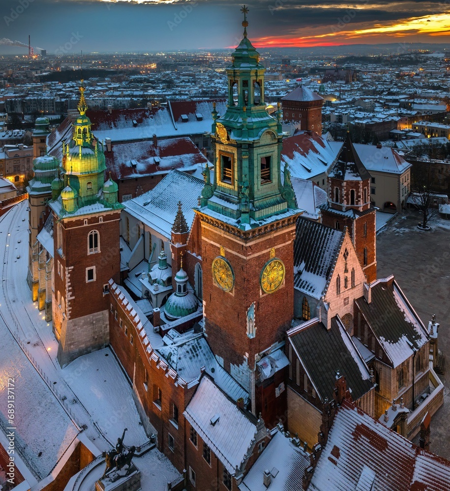 Zamek Królewski na Wawelu zimą widziany z drona o poranku