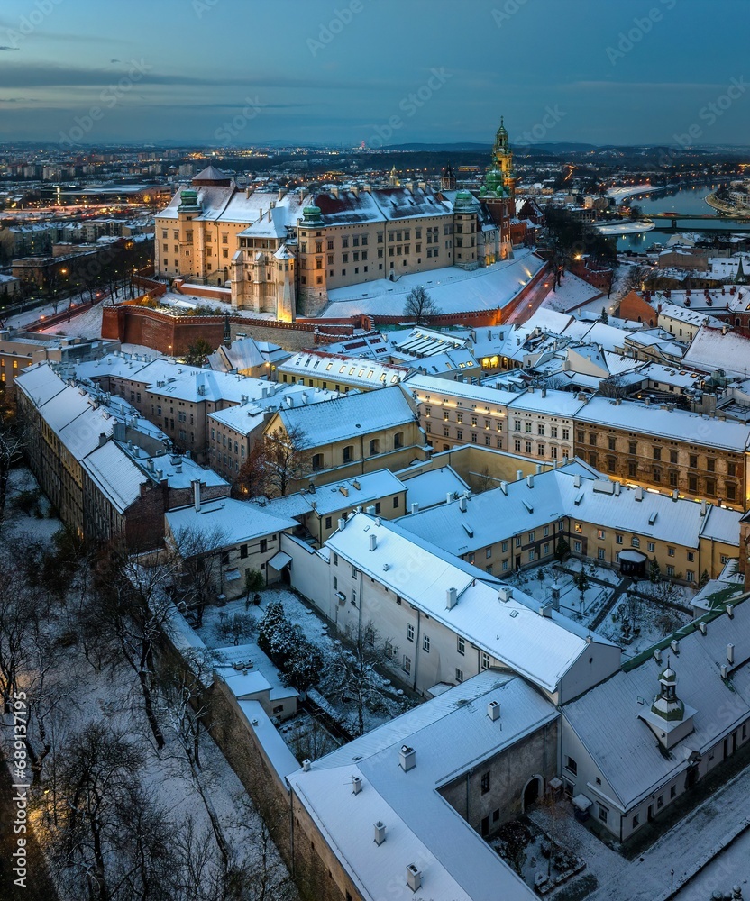 Zamek Królewski na Wawelu zimą widziany z drona o poranku