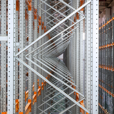 Metal shelving and rack system inside modern warehouse close-up