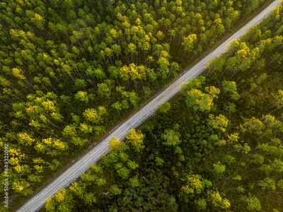 sandy road at sunrise - Apalachicola National Forest in Florida, aerial view