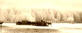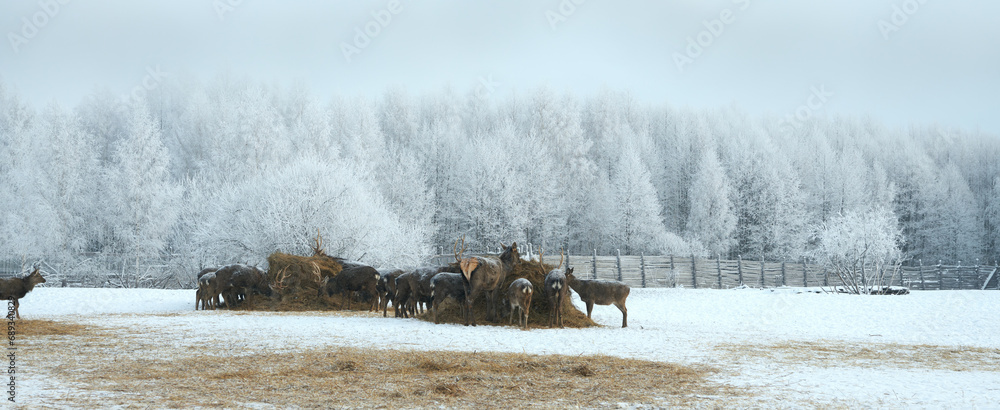 Picturesque winter landscape with trees in hoarfrost. A herd of reindeer feeding on hay in a specially equipped trough at the edge of a frost-covered forest.