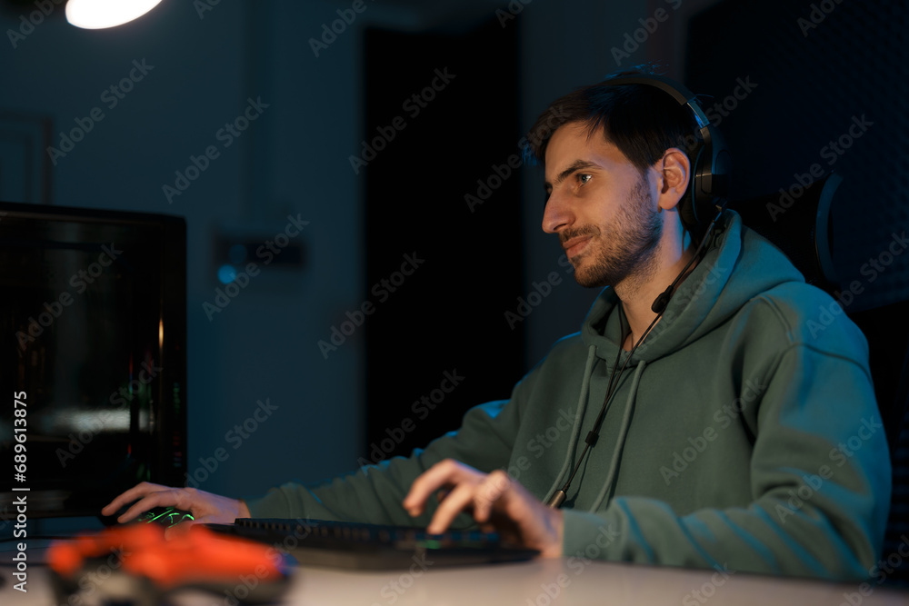Side view of concentrated male eSport gamer in headphones with microphone sitting at white table and playing video game on desktop in dark room