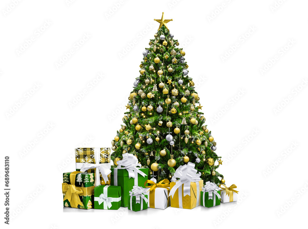 Decorated by gold and silver fir tree with presents isolated on white
