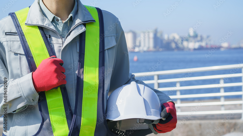 ヘルメットと作業服の男性・海と工業地帯│建設業・製造業・プラント イメージ