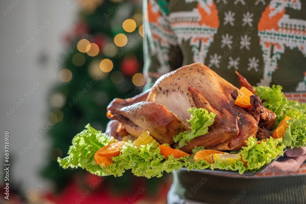 Turkey dinner Thanksgiving food. Man carry Christmas turkey food dinner Serve on table. Baked turkey chicken garnished with family Christmas tree and burning candles . Roasted turkey table setting