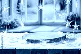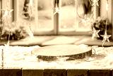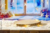 Window sill background and Christmas tree decoration, Happy New Year party , pedestal card, empty space and pattern, family home interior, celebration time in cold december night.