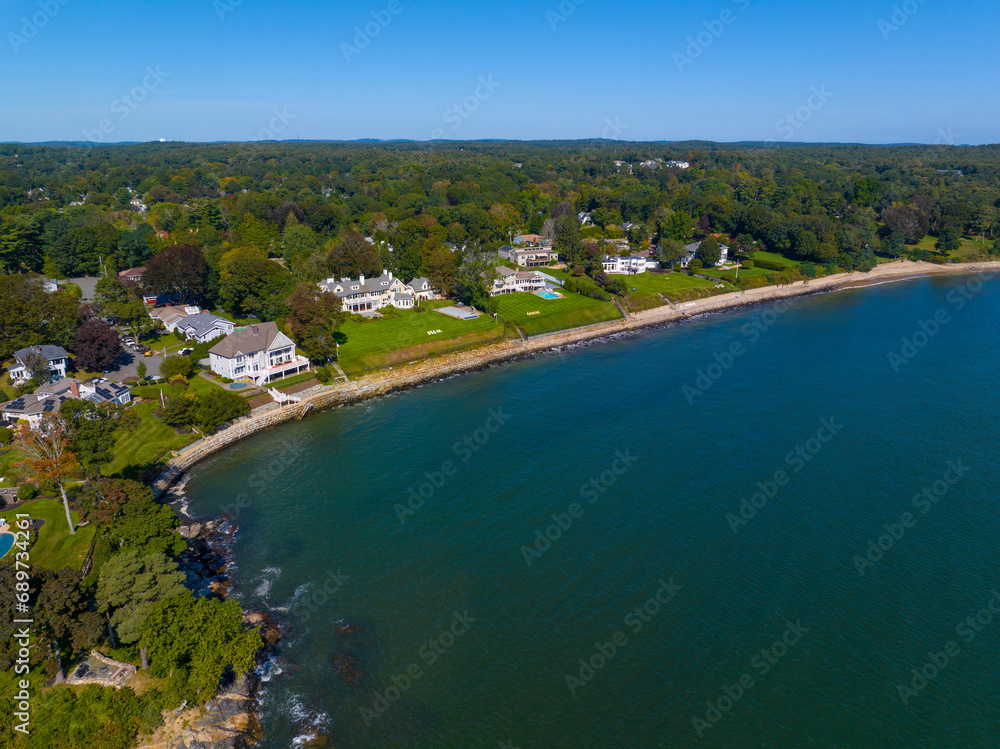 Patch Beach and Brackenbury Beach aerial view at Beverly Cove with Curtis Point at fall in town of Beverly, Massachusetts MA, USA.
