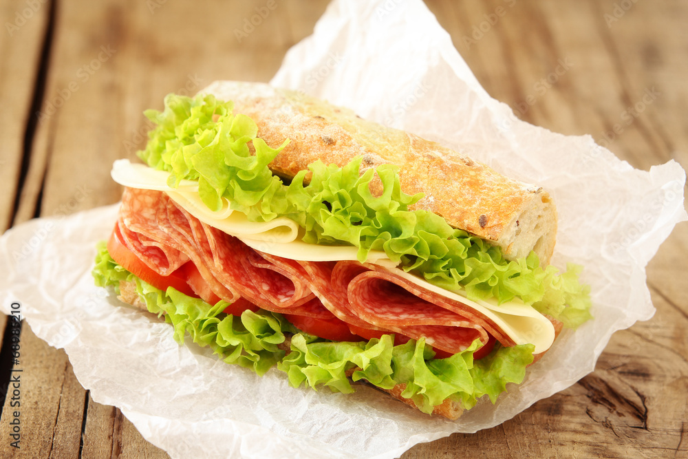 Fresh sandwich with salami, cheese, tomatoes and lettuce