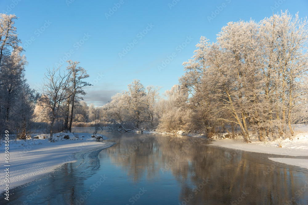 River on cold winter day, with trees covered in snow or frost, reflected in the water