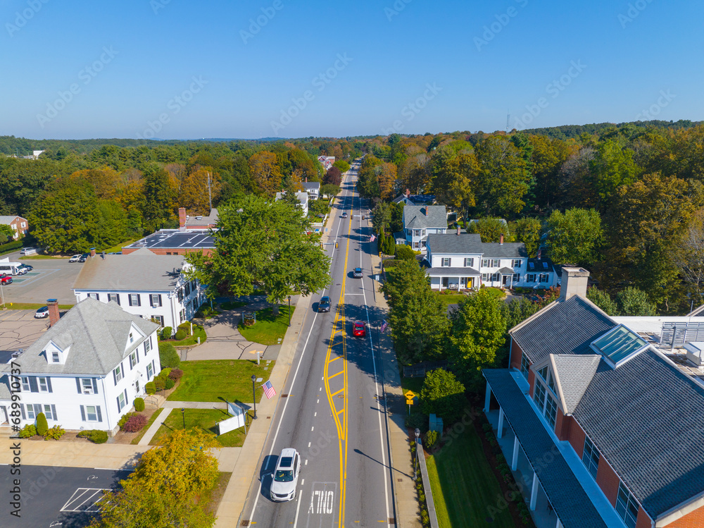 Westwood historic town center aerial view on High Street at fall in town of Westwood, Massachusetts MA, USA.