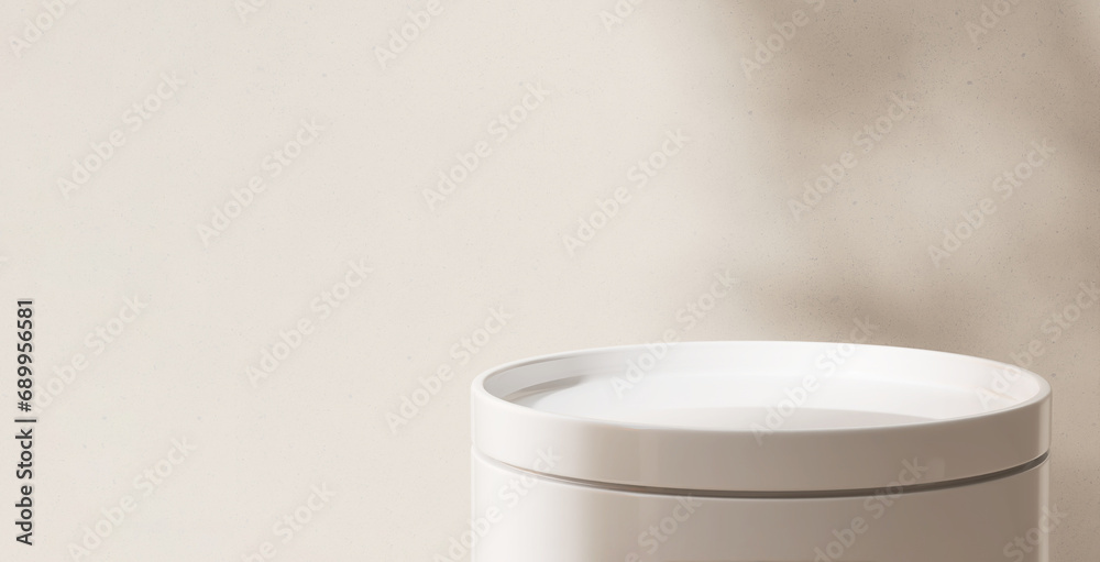 Modern round white podium table in dappled sunlight, leaf shadow on beige wall for luxury organic cosmetic, skincare, beauty, body, hair care, treatment, fashion product display background 3D
