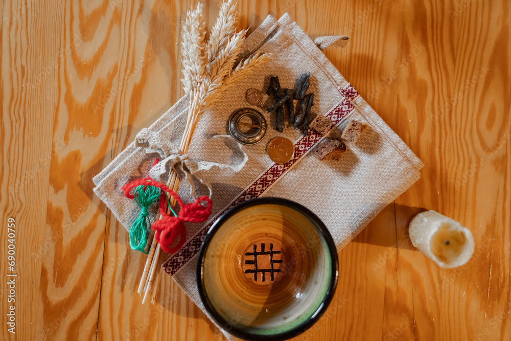 Sauna ritual instruments and clay pots ready for sauna with pagan Baltic symbols