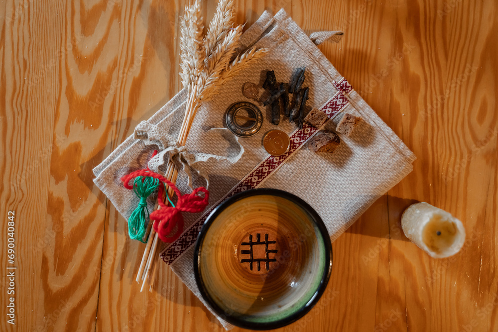 Sauna ritual instruments and clay pots ready for sauna with pagan Baltic symbols