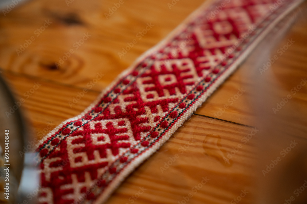 Latvian sauna traditions with Lielvardes Josta and dried herbs and fruits and candles on a wooden table
