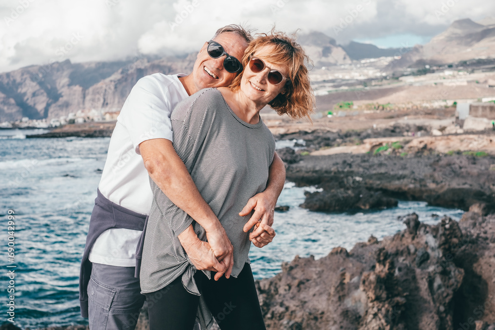 Lovely mature and romantic senior couple embrace each other on the seashore looking into each other's eyes, two embraced people stay together expressing love and tenderness