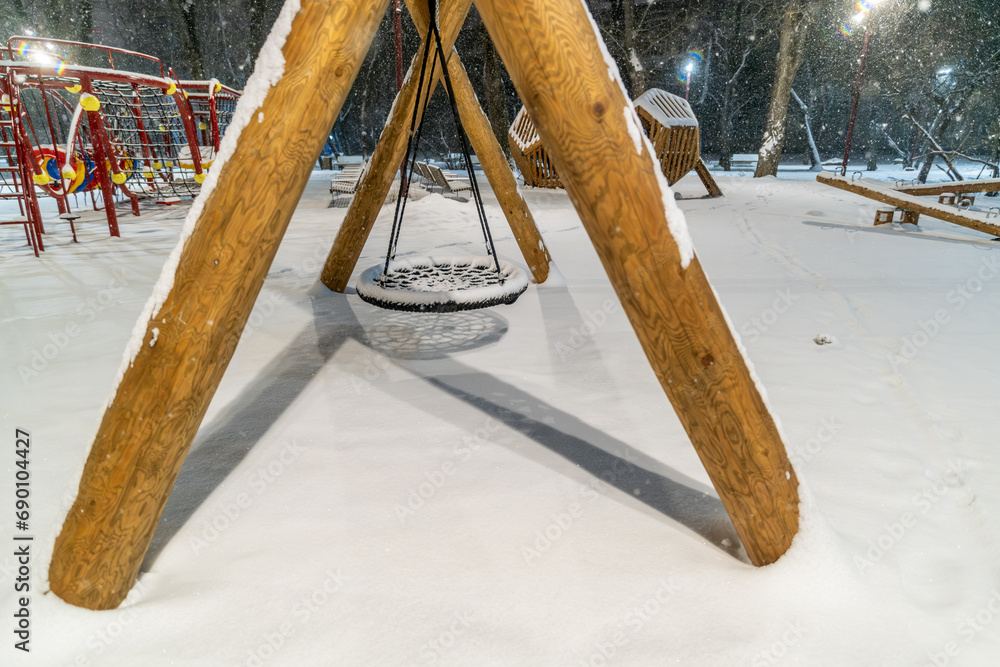 Swings for children in the park on a winter evening.