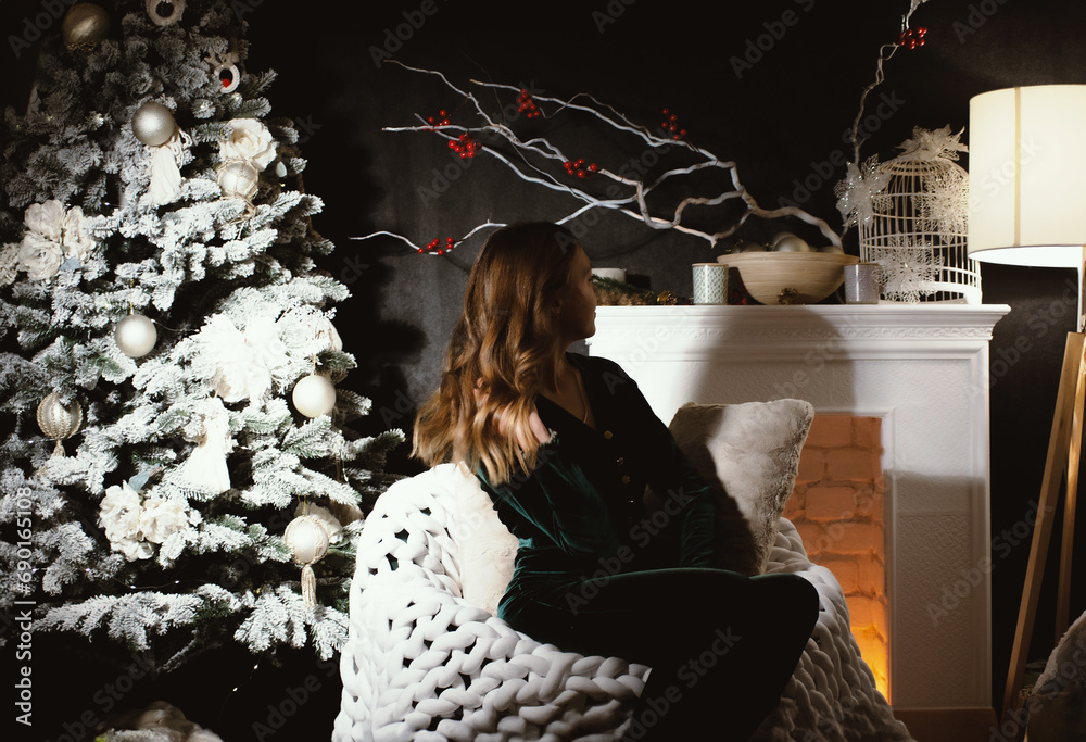 A girl sits in a chair in the evening against the background of a New Year tree with a fireplace.