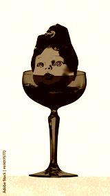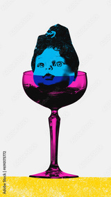 Female doll head diving into glass with wine over white background. Contemporary art collage. Concept of surrealism, y2k, creativity, imagination, inspiration, retro style. Colorful design