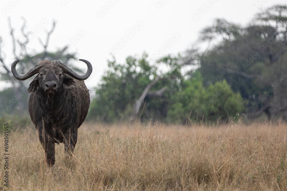 An African buffalo or Cape buffalo (Syncerus caffer) in Tanzania.