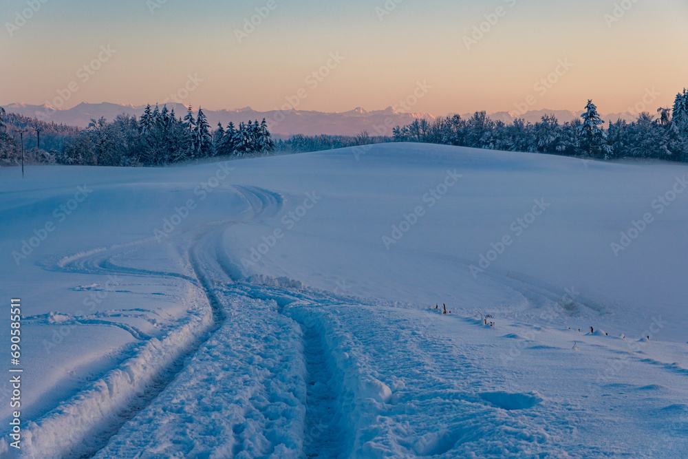 Snowy and beautiful winter landscape in Wolfegg in Upper Swabia