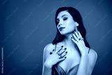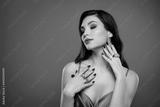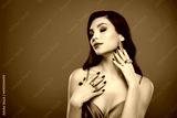 Photo of dreamy shiny lady wear silk dress jewelry touching neck empty space isolated brown color background