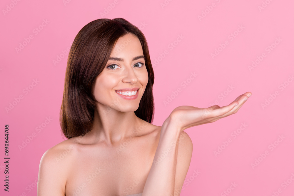 Photo of nice attractive girl beautician hold hand promoting skin body health care offers isolated over pastel color background