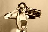 Photo of positive girl having boom box for disco party on christmas new year isolated vivid color background