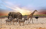 Elephant, Giraffe and Zebra standing close together on the dry arid African plains