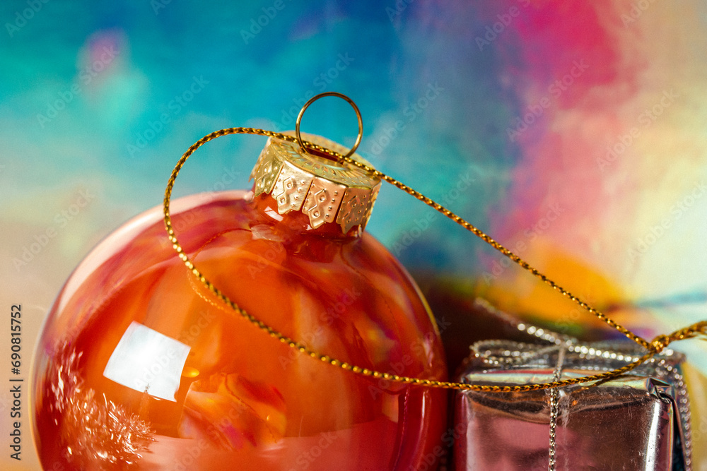 Christmas balls on abstract background. Bright orange glass glitter Christmas tree ball toy, small silver gift box on multicolored gradient background. A card for New Year's Eve 2024, Christmas Day.