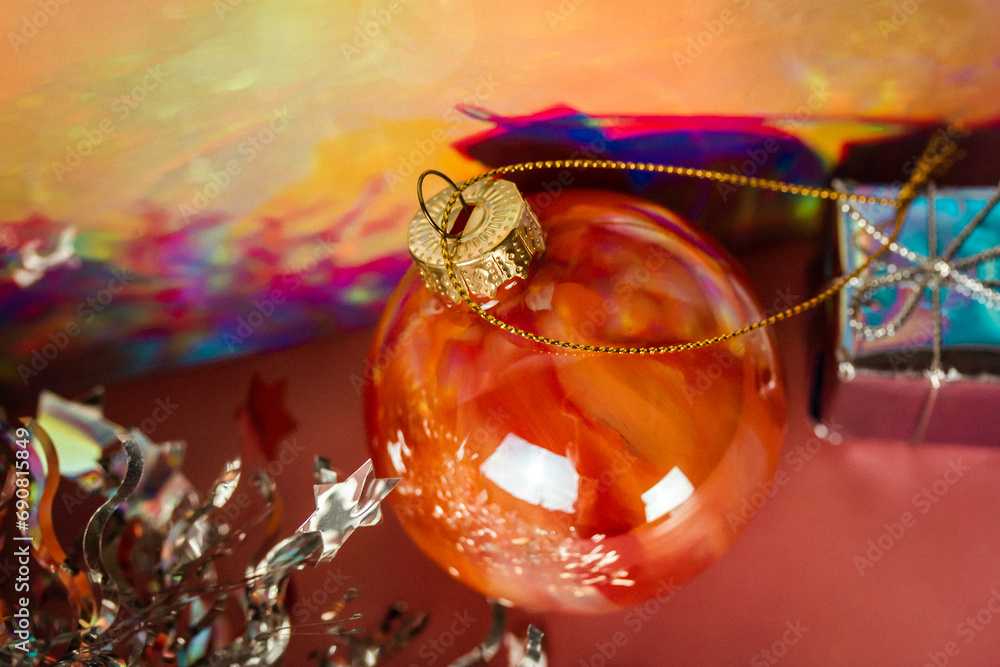Christmas balls on abstract background. Bright orange glass glitter Christmas tree ball toy, small silver gift box on multicolored gradient background. A card for New Year's Eve 2024, Christmas Day.