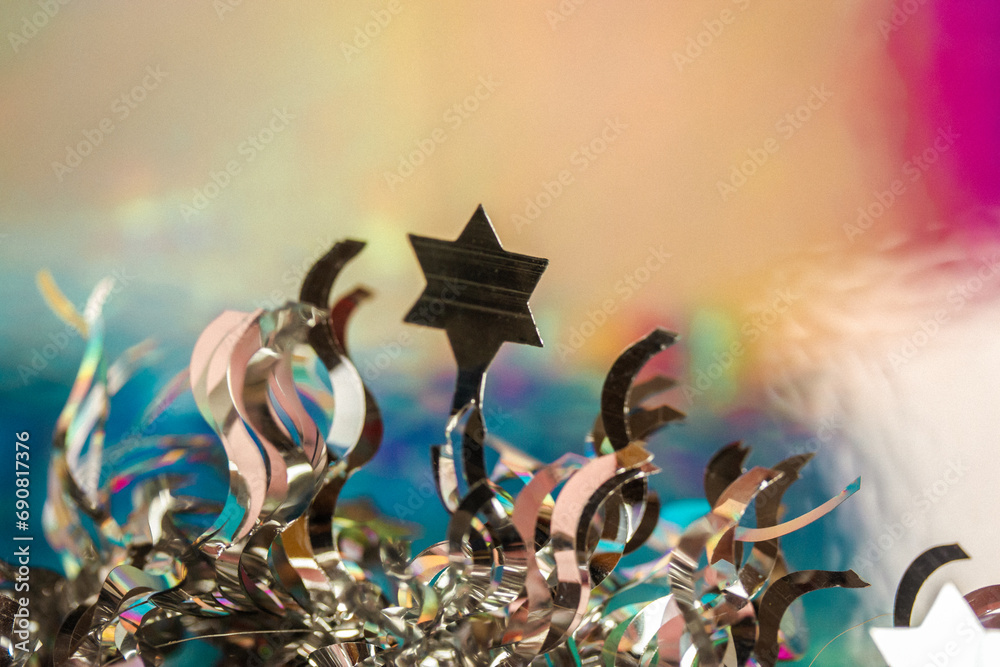 Shiny holographic silvery tinsel, star-shaped tinsel on bright colorful yellow background. New Year and Christmas winter holidays 2024 decor. Abstract festive wallpaper. Make a with on a falling star