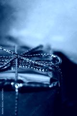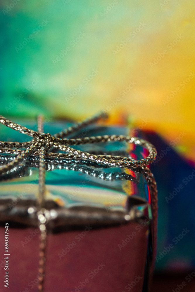 Silver gift box on multicolored bright gradient background with space for text. Holidays greetings concept. Merry Christmas and Happy New Year 2024. Positive vibes colors. Colorful present wallpaper.