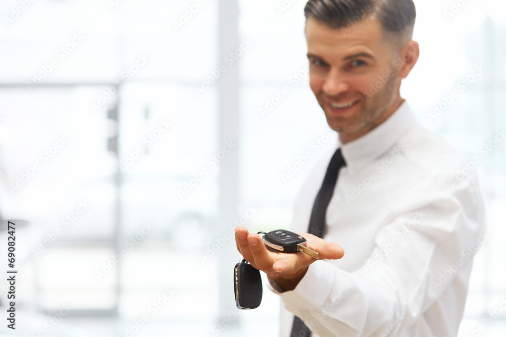 Car Salesman Giving Key of New Car at Showroom