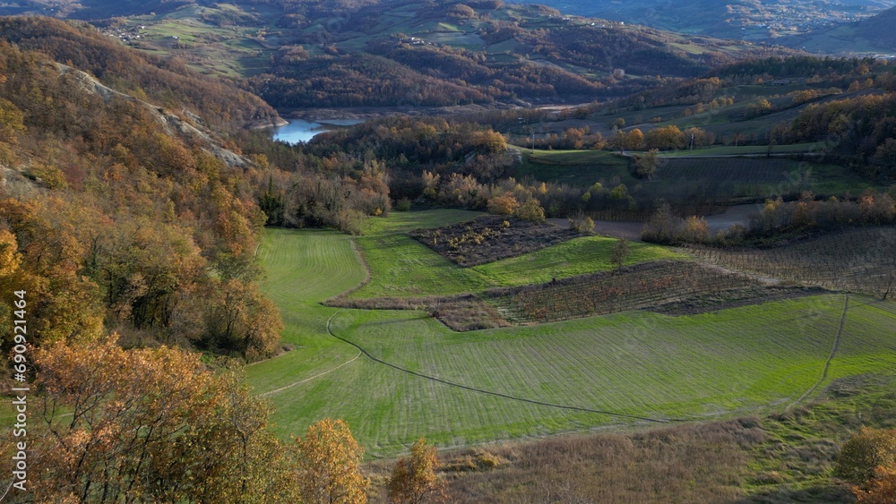 Europe, Italy, Oltrepo Pavese - drone aerial view of amazing Appenines hill in autumn foliage in Lombardy - wheat field in winter
